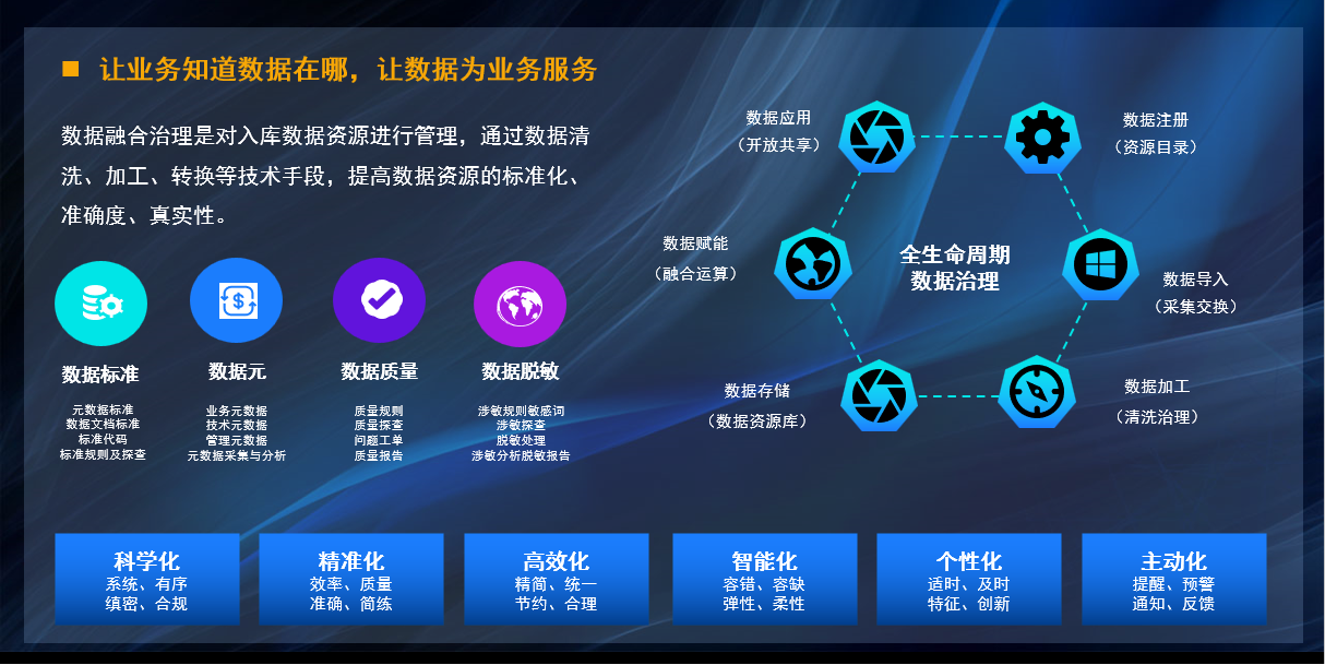 一、產(chǎn)品簡介數(shù)據(jù)融合治理是對入庫數(shù)據(jù)資源進行管理,通過數(shù)據(jù)清洗、加工、轉(zhuǎn)換等技術(shù)手段,提高數(shù)據(jù)資源的標準化、準確度和真實性,貫穿于數(shù)據(jù)注冊、數(shù)據(jù)導入、數(shù)據(jù)加工、數(shù)據(jù)存儲、數(shù)據(jù)賦能、數(shù)據(jù)應用的全生命周期數(shù)據(jù)治理,包含數(shù)據(jù)質(zhì)量系統(tǒng)和數(shù)據(jù)…